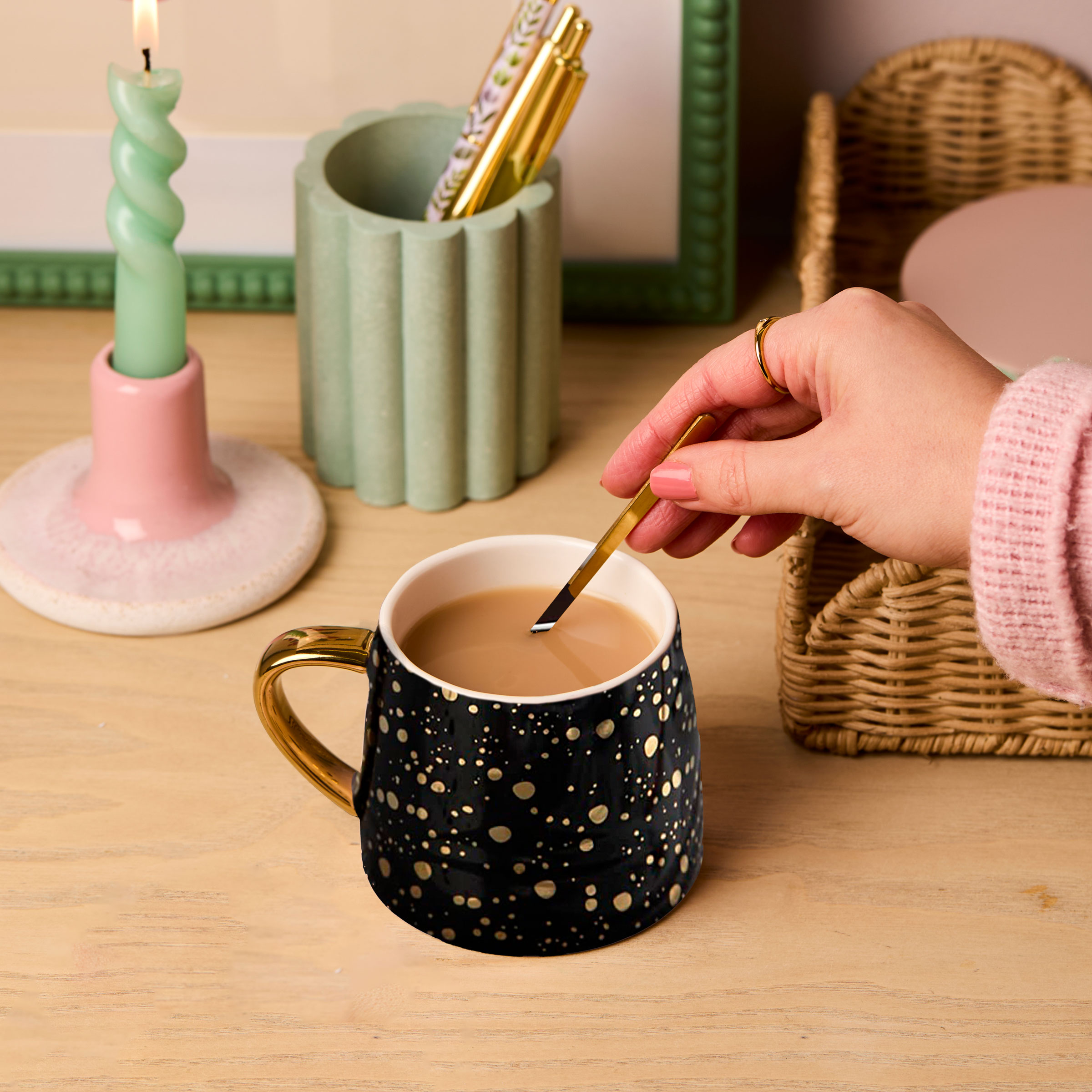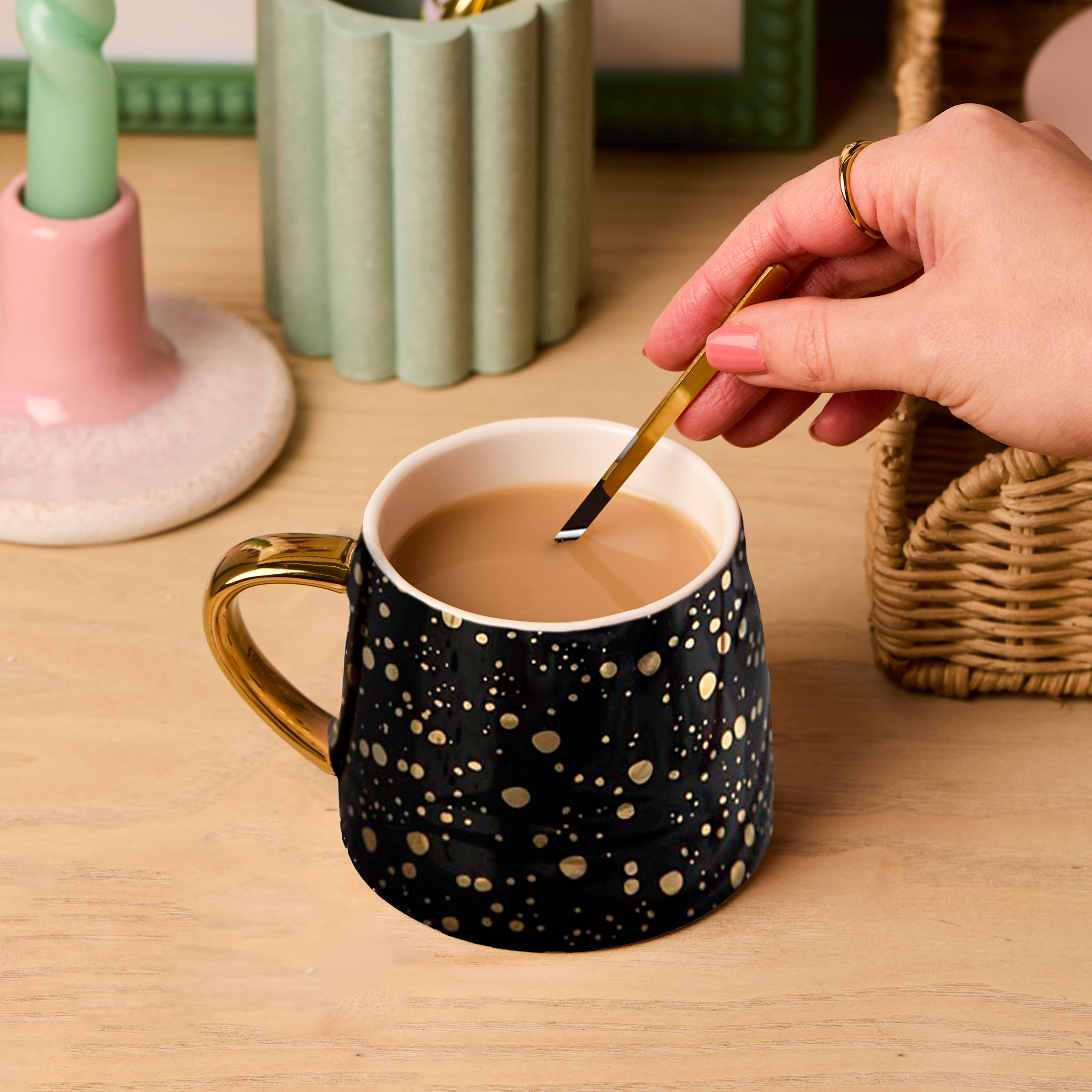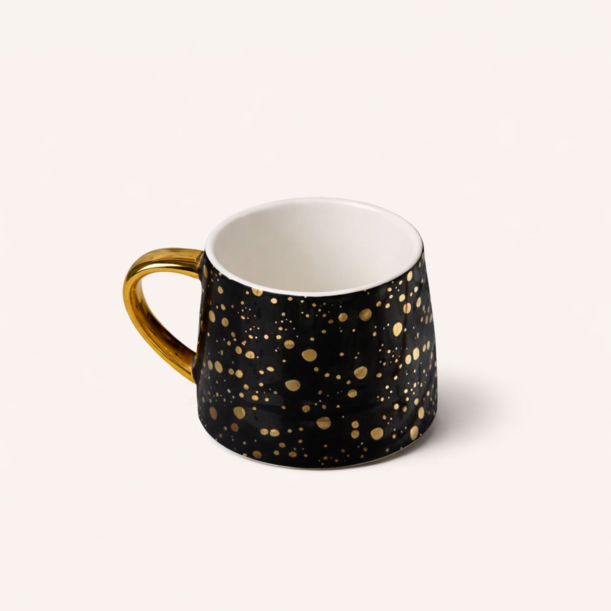 The mug is made from porcelain with black gloss and gold speckled design finished with matching gold handle.