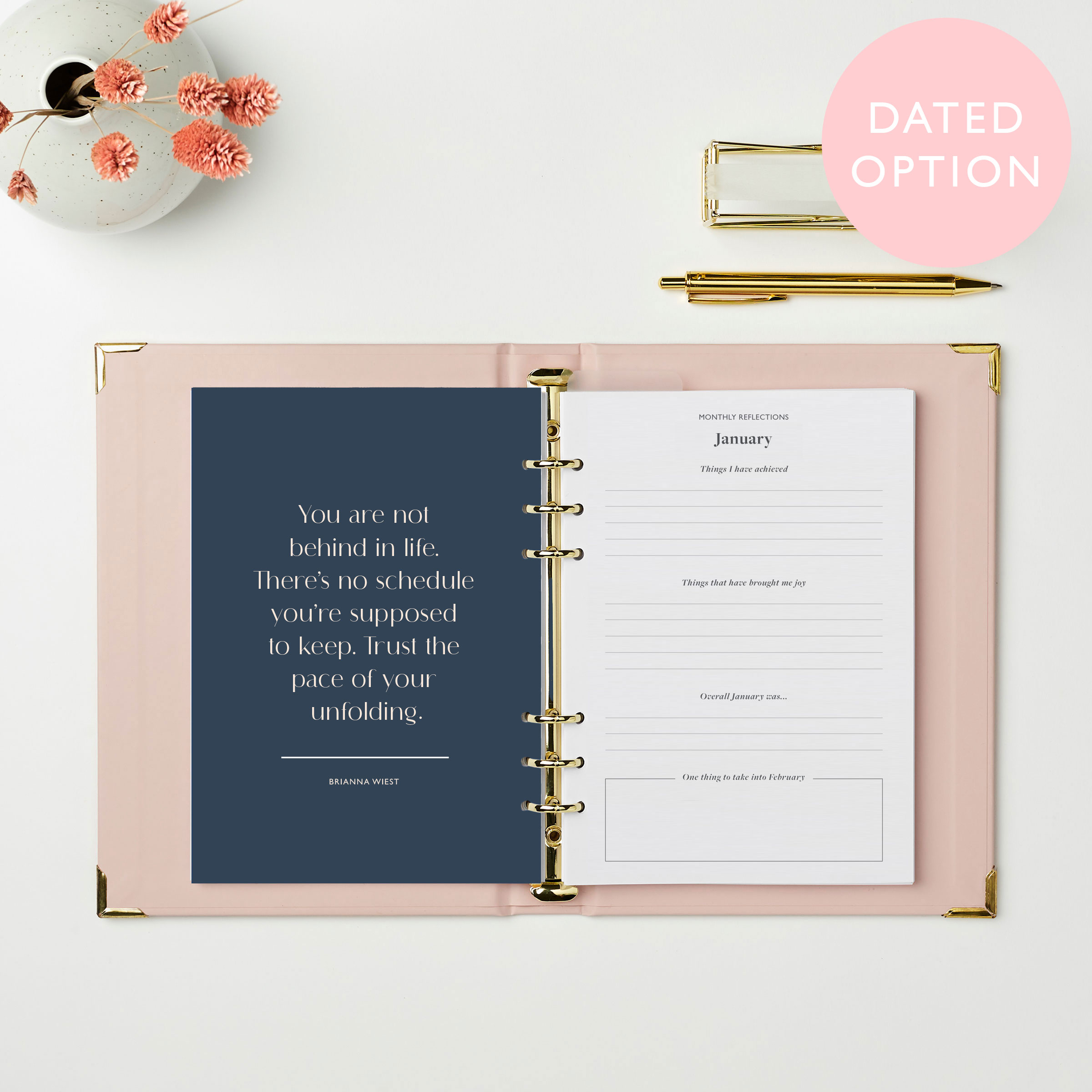 The refillable planner contains gold binding that easily clicks open so additional content can be added throughout the year or the folder can be reused in years to come.