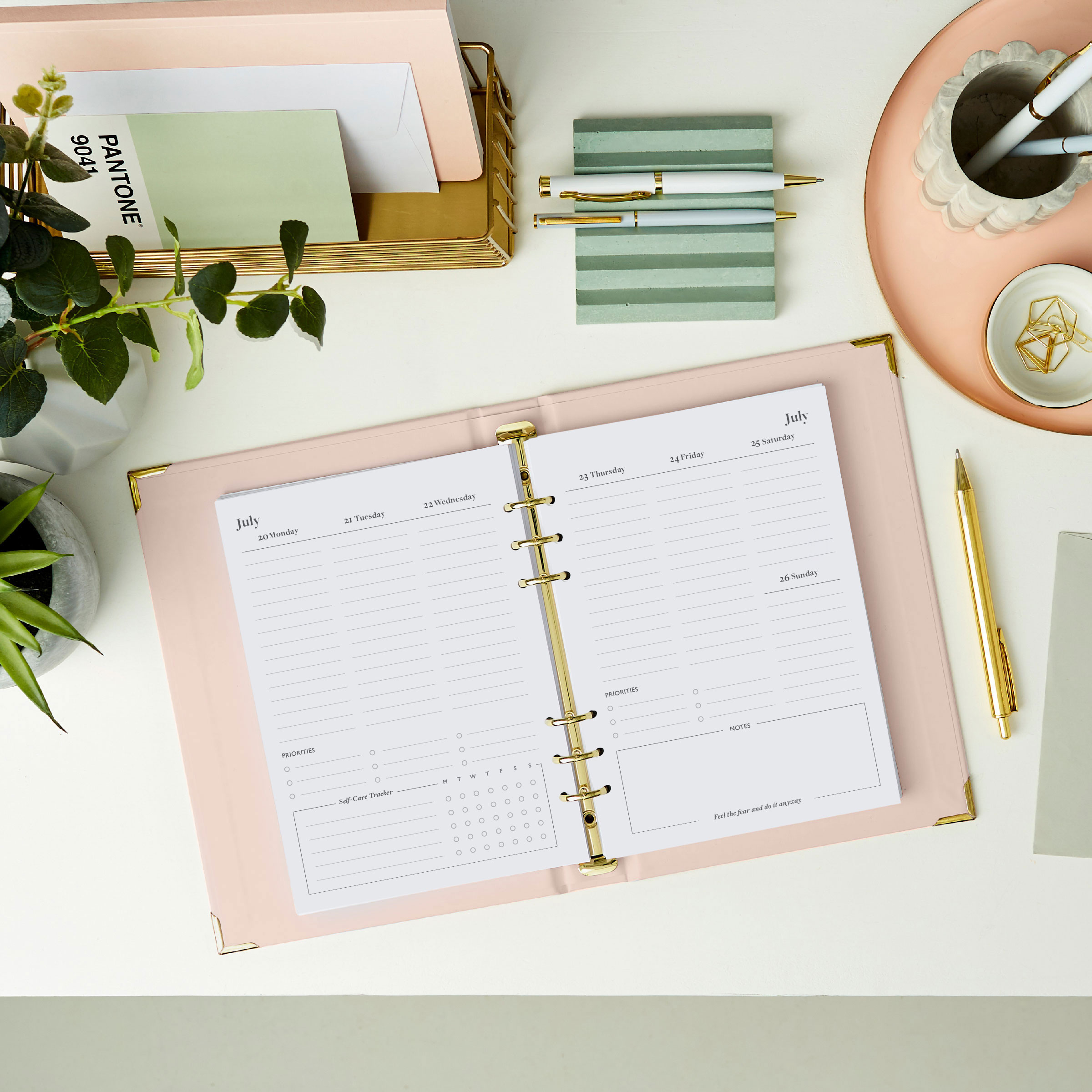 • Weekly planner spreads with space to set daily priorities, a weekly self-care tracker and weekly thoughtful quotes