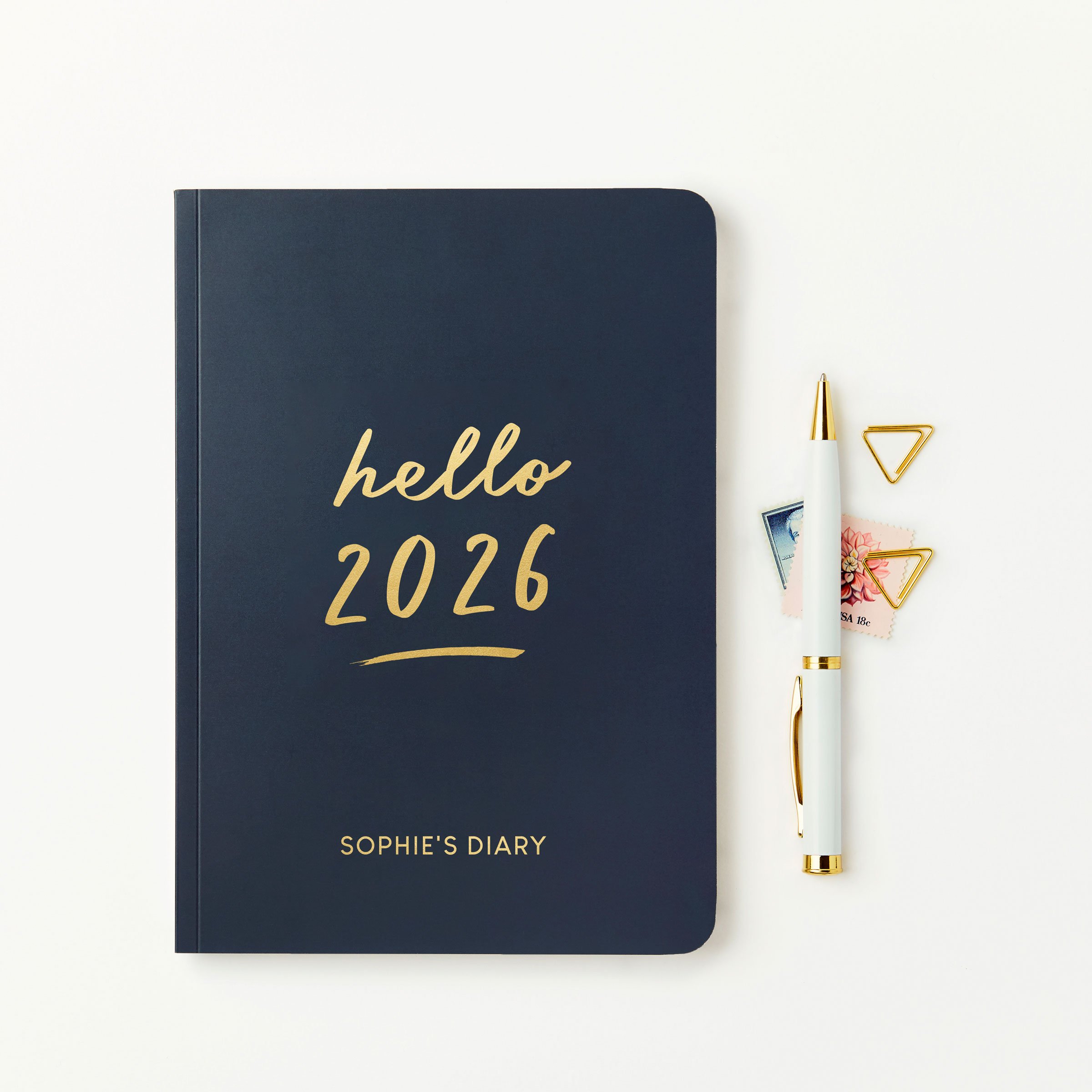 A stunning Personalised Hello 2026 Weekly Diary, featuring modern calligraphy that reads ‘hello 2026’, personalised with a name of your choice.