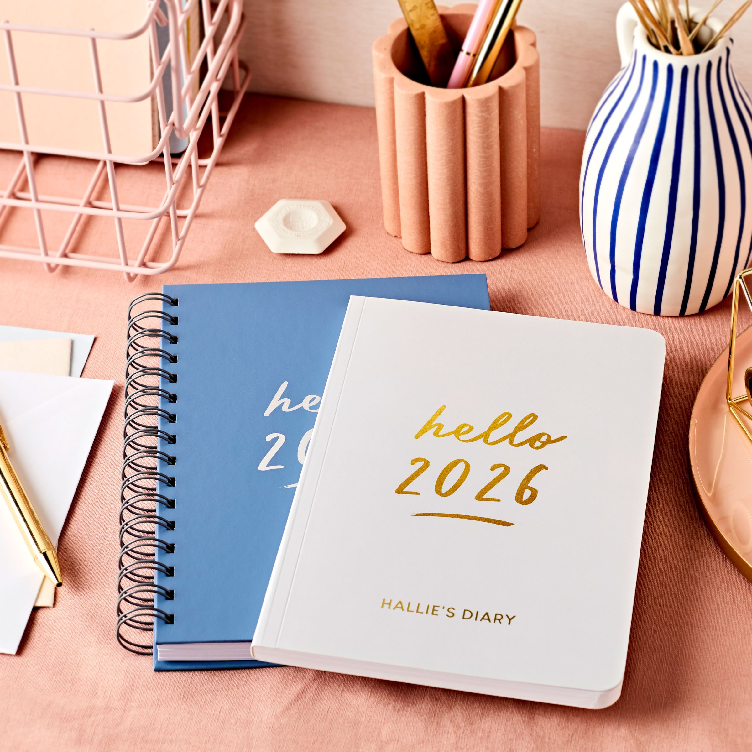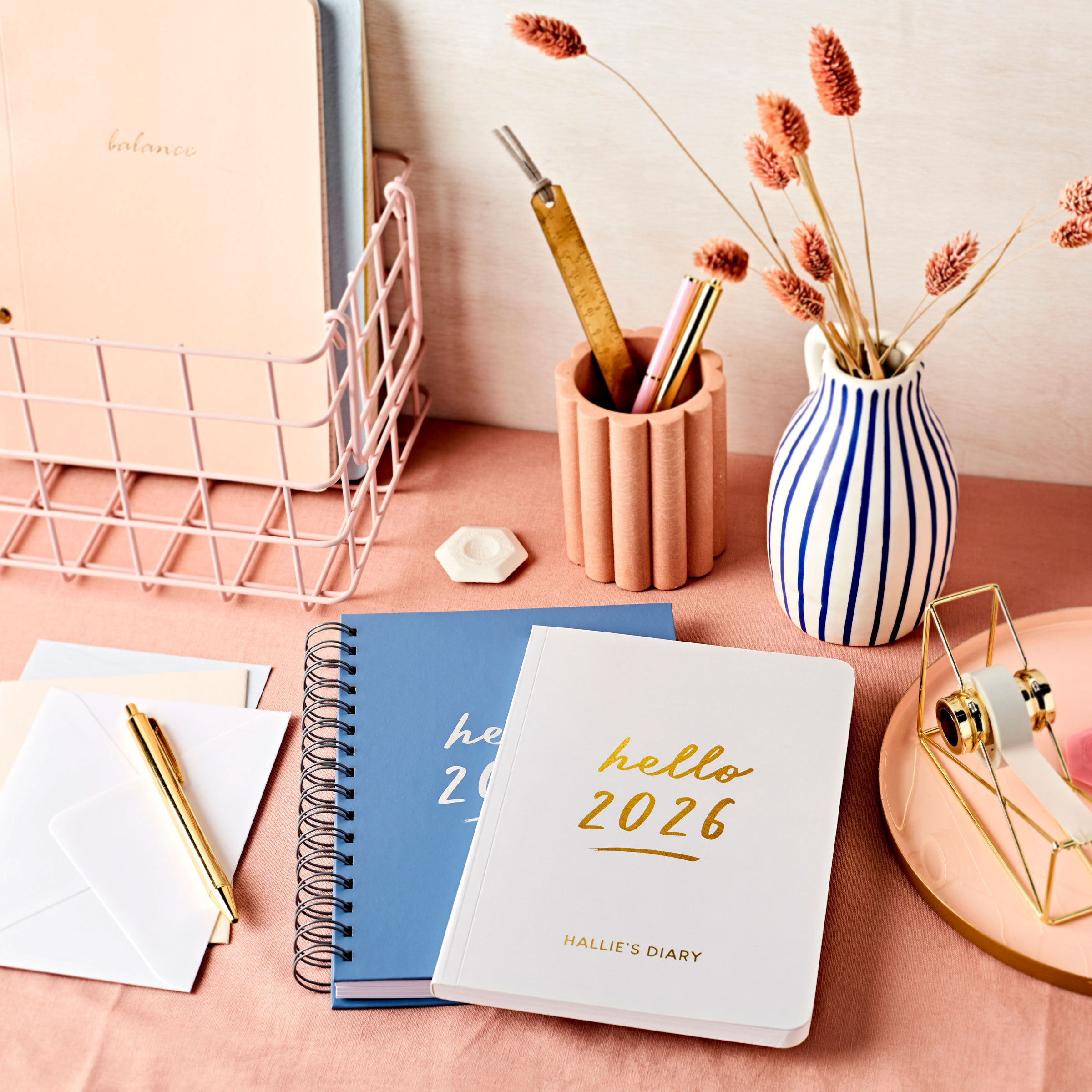 Our Personalised Hello 2026 Weekly Diary is hand produced in our West London studio. Softback diary: so beautiful you’ll want to show it off, but lightweight enough to carry with you. Filled with 100gsm pages. Hardback diary: the luxury hardcovers are coated in a specialist book cover material that feels soft to the touch and is wire bound (similar to spiral binding). Filled with 120gsm pages. Inside both options are week-to-view diary pages for 2026, a 2026 and 2027 yearly planner, and several notes pages printed on thick blank white paper. In total the diary contains 140 pages (or 70 sheets).