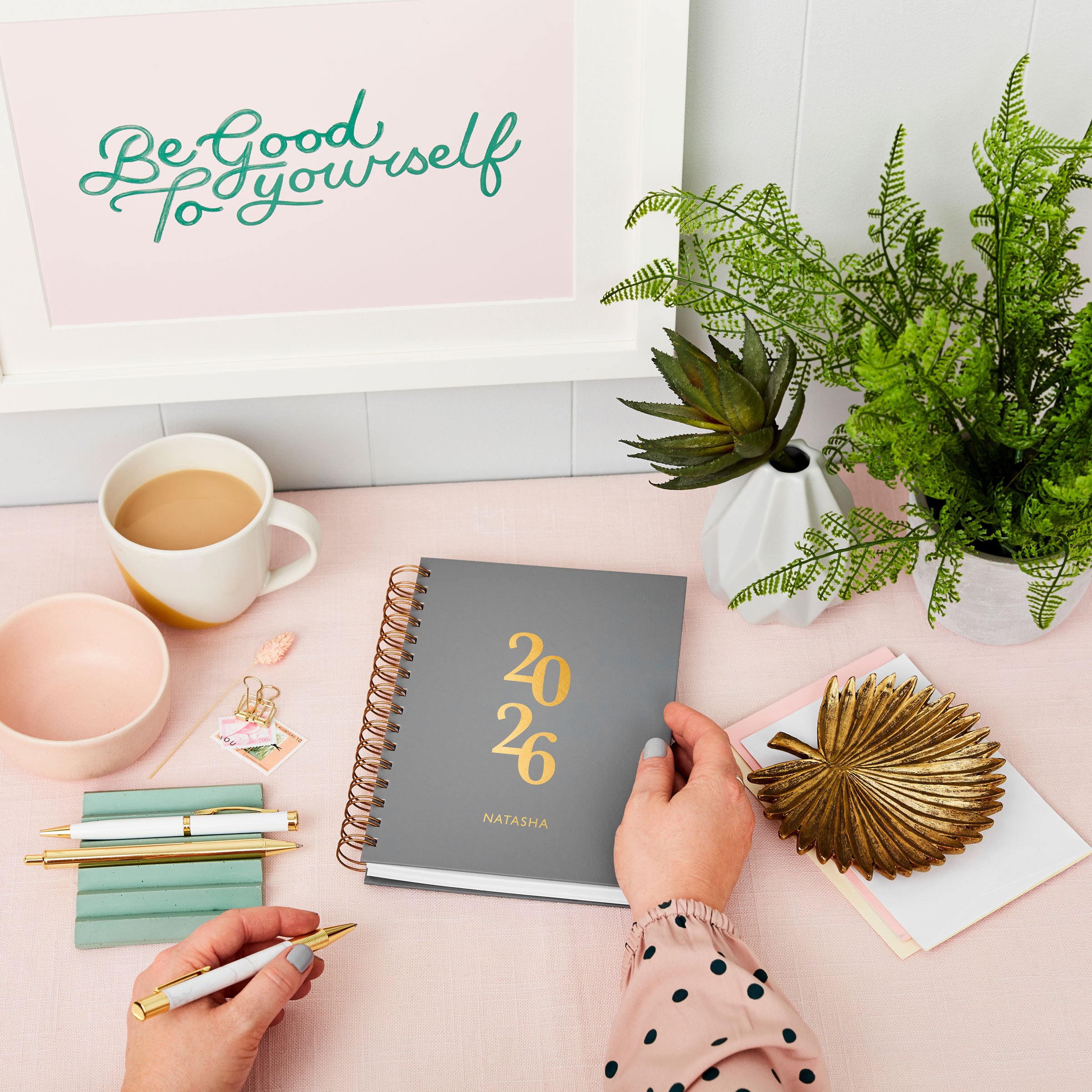 Personalise the diary with a name of your choice, a range of stunning colour and foiling options, making it a thoughtful gift or treat for your desk. Choose your Original 2026 Diary format from weekly or daily options with your choice of gold or silver foil for the cover.