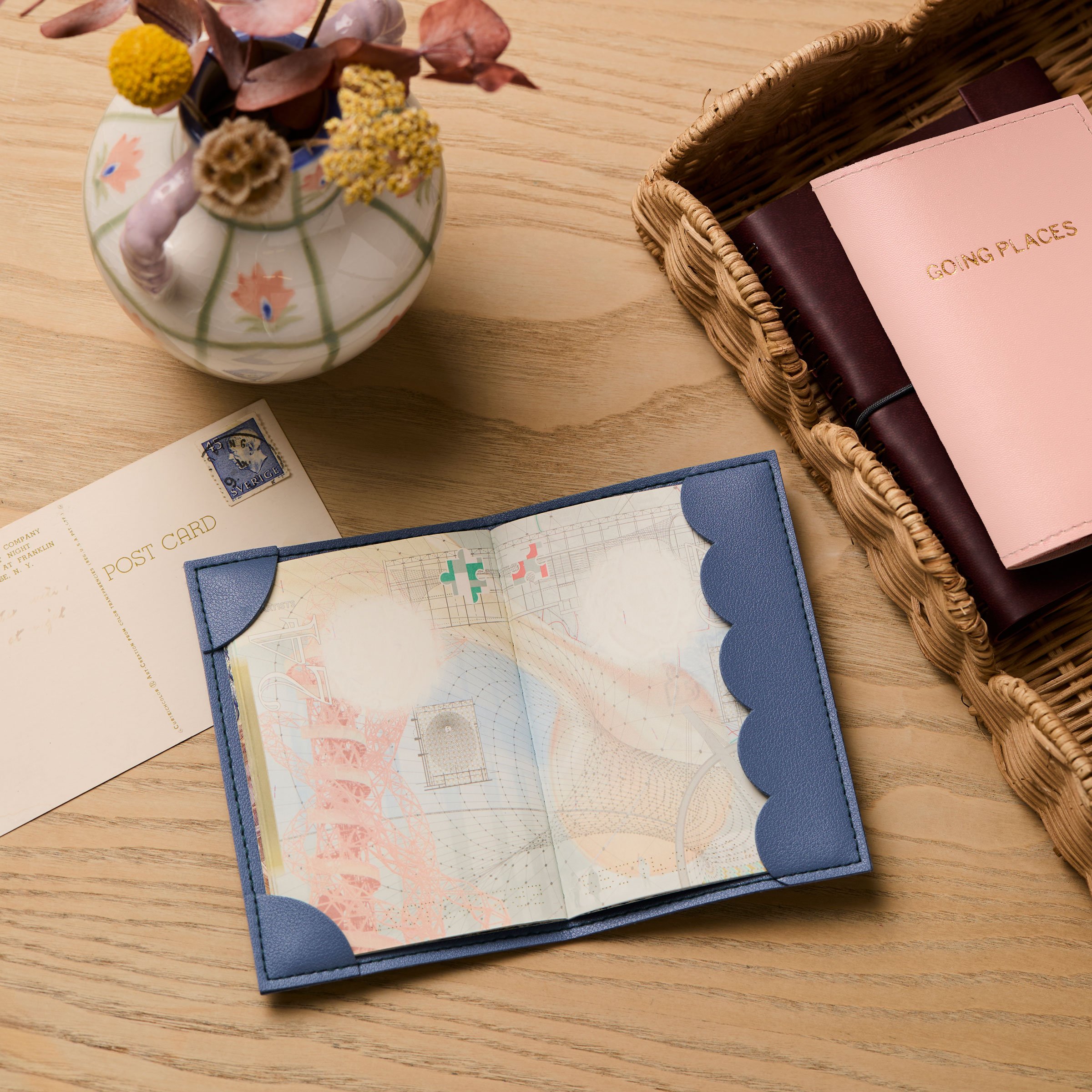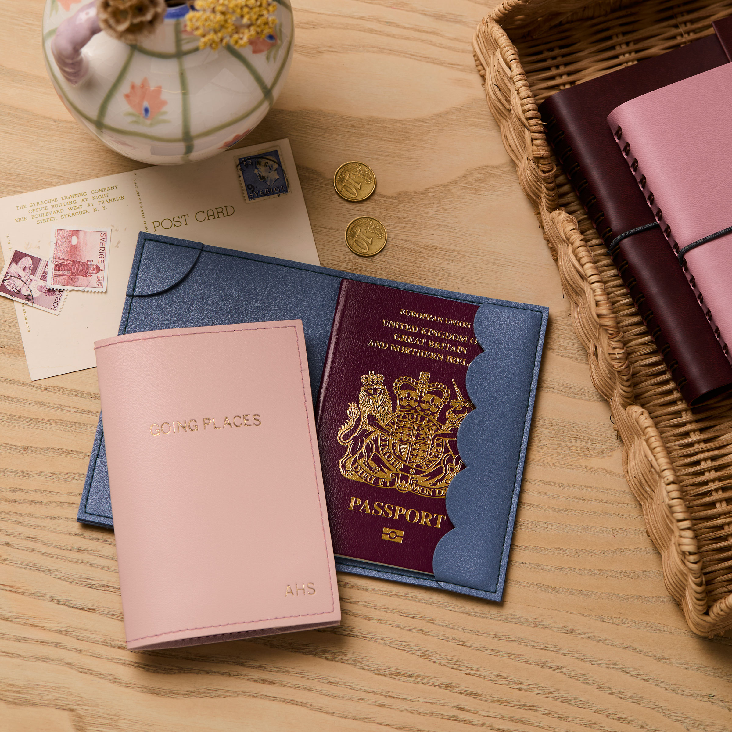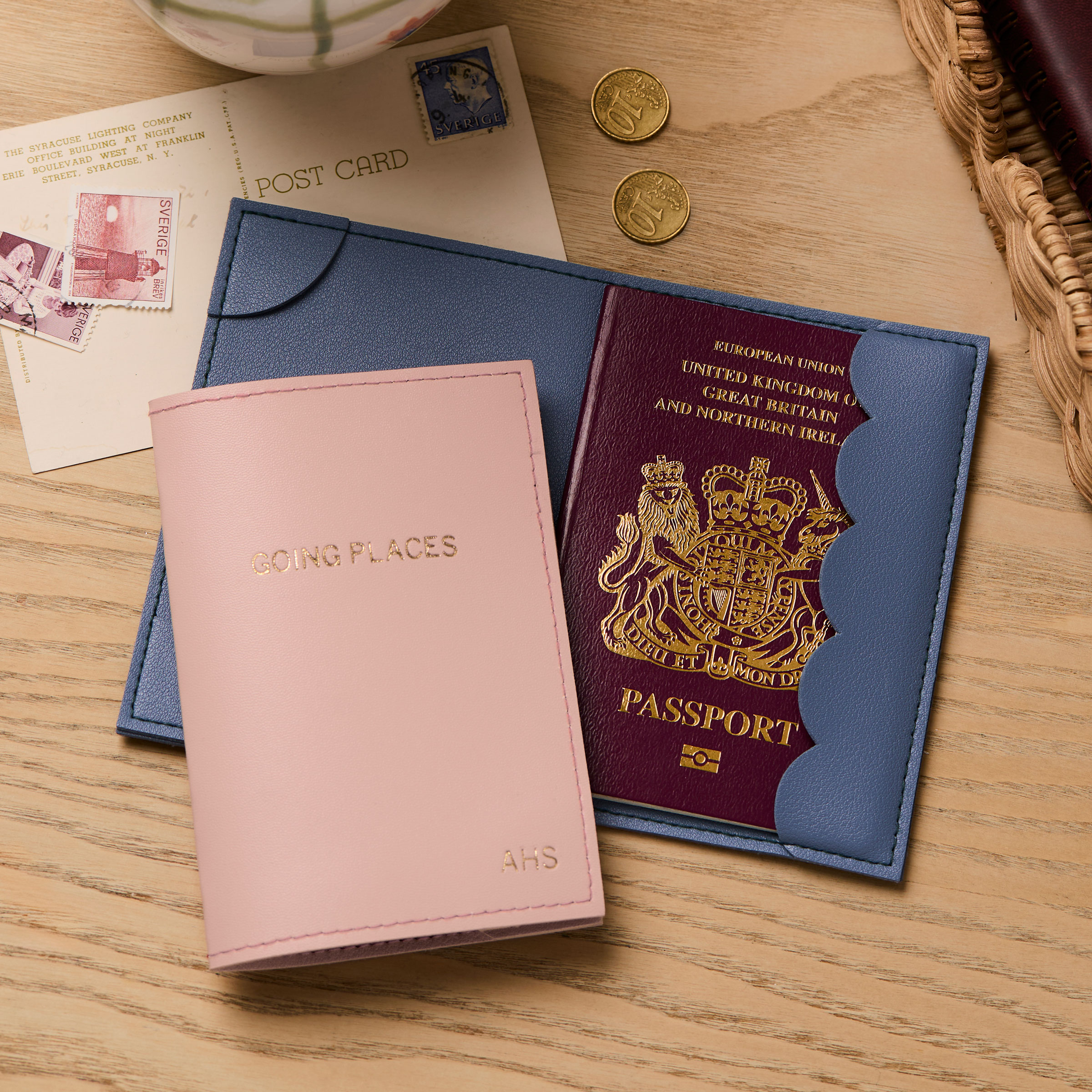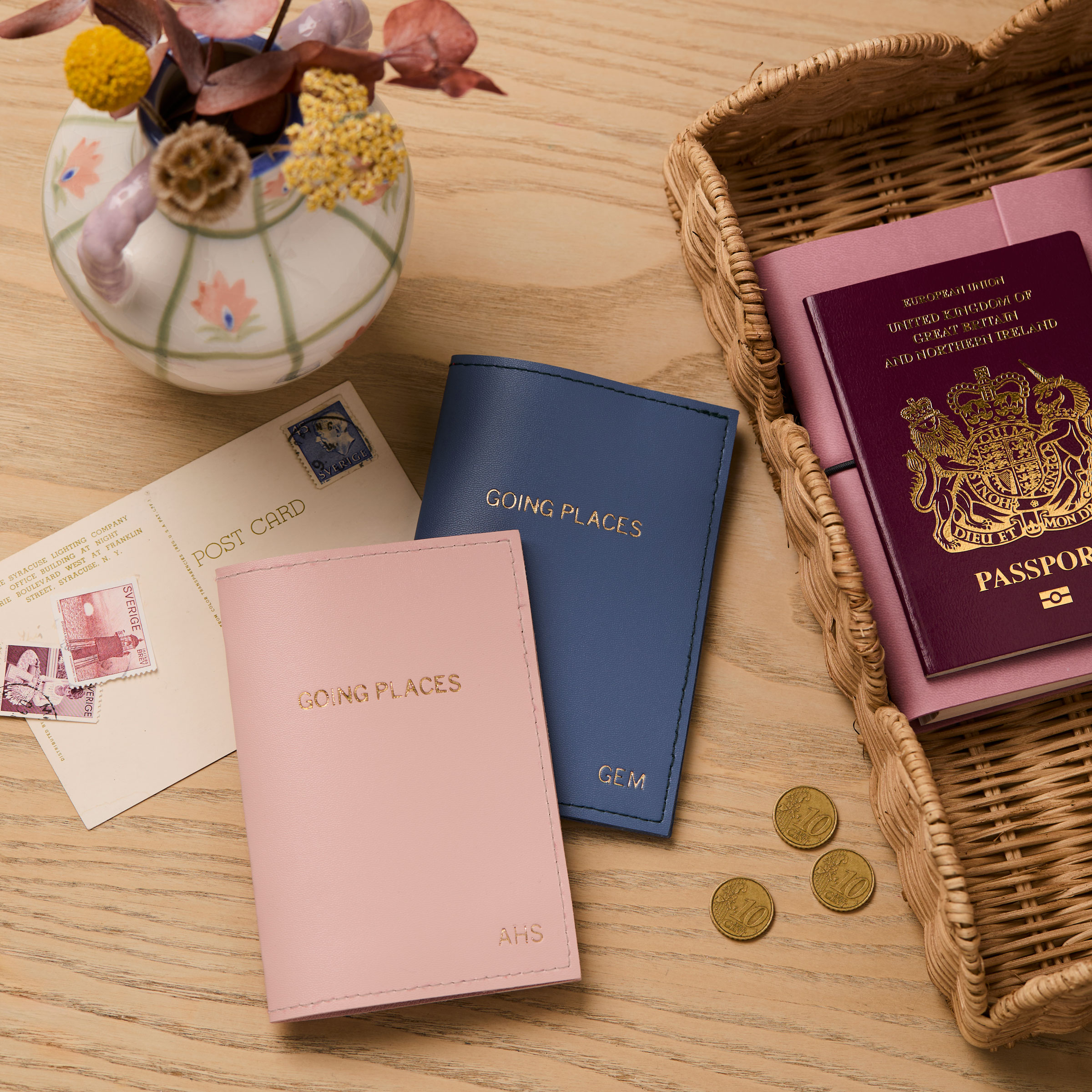 Travel in style with the personalised passport holder, made from a soft vegan leather and embossed with the phrase ‘Going places’. Choose from our two stylish colours; mid blue or blush pink. The perfect travel accessory, this charming passport holder makes a lovely leaving gift for someone who’s planning the trip of a lifetime.