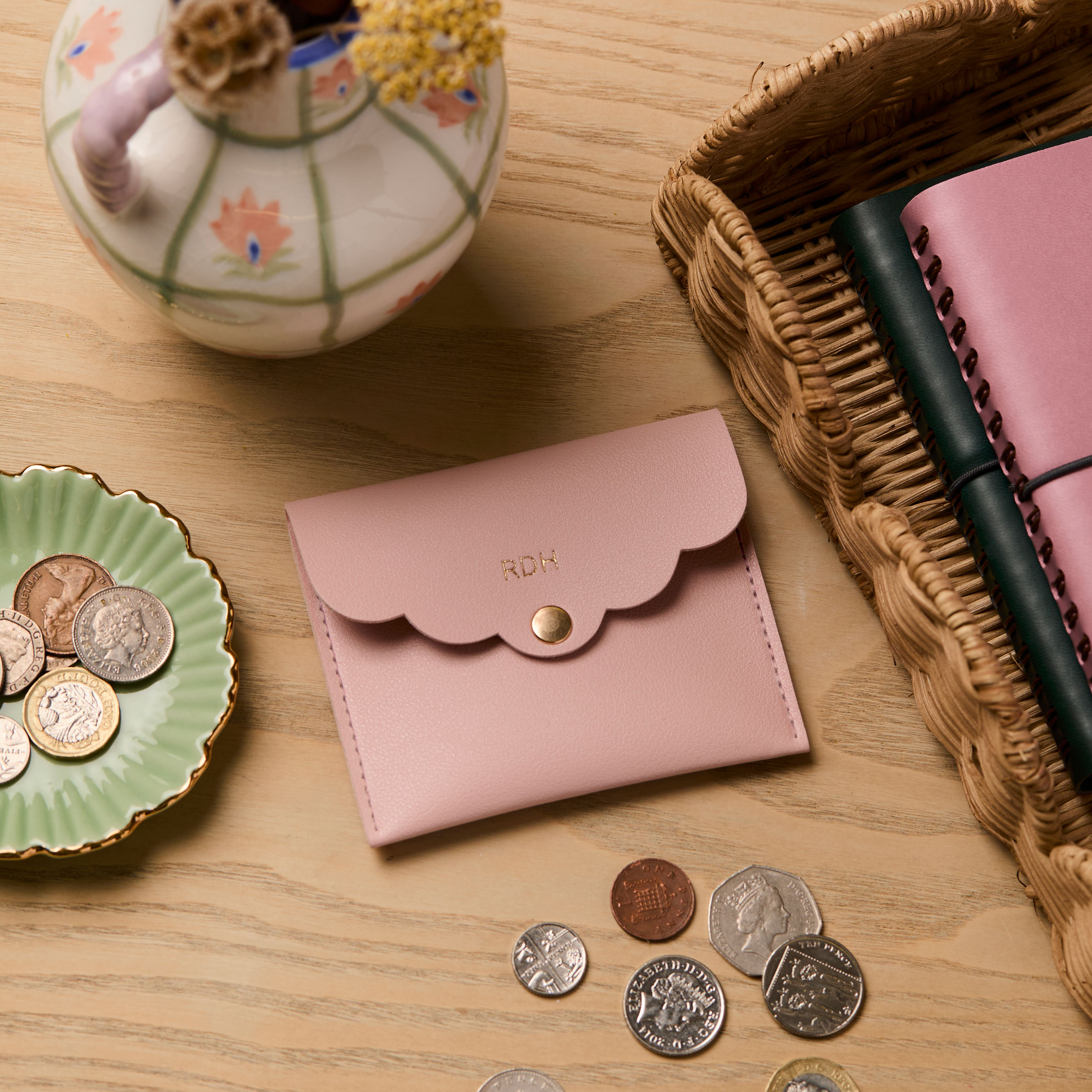 Keep your everyday essentials close to hand with this charming personalised scallop mini pouch. The perfect size to fit bank cards, notes, keys, earphones, lip balm and more, this lovely little pouch can be personalised with initials of your choice.