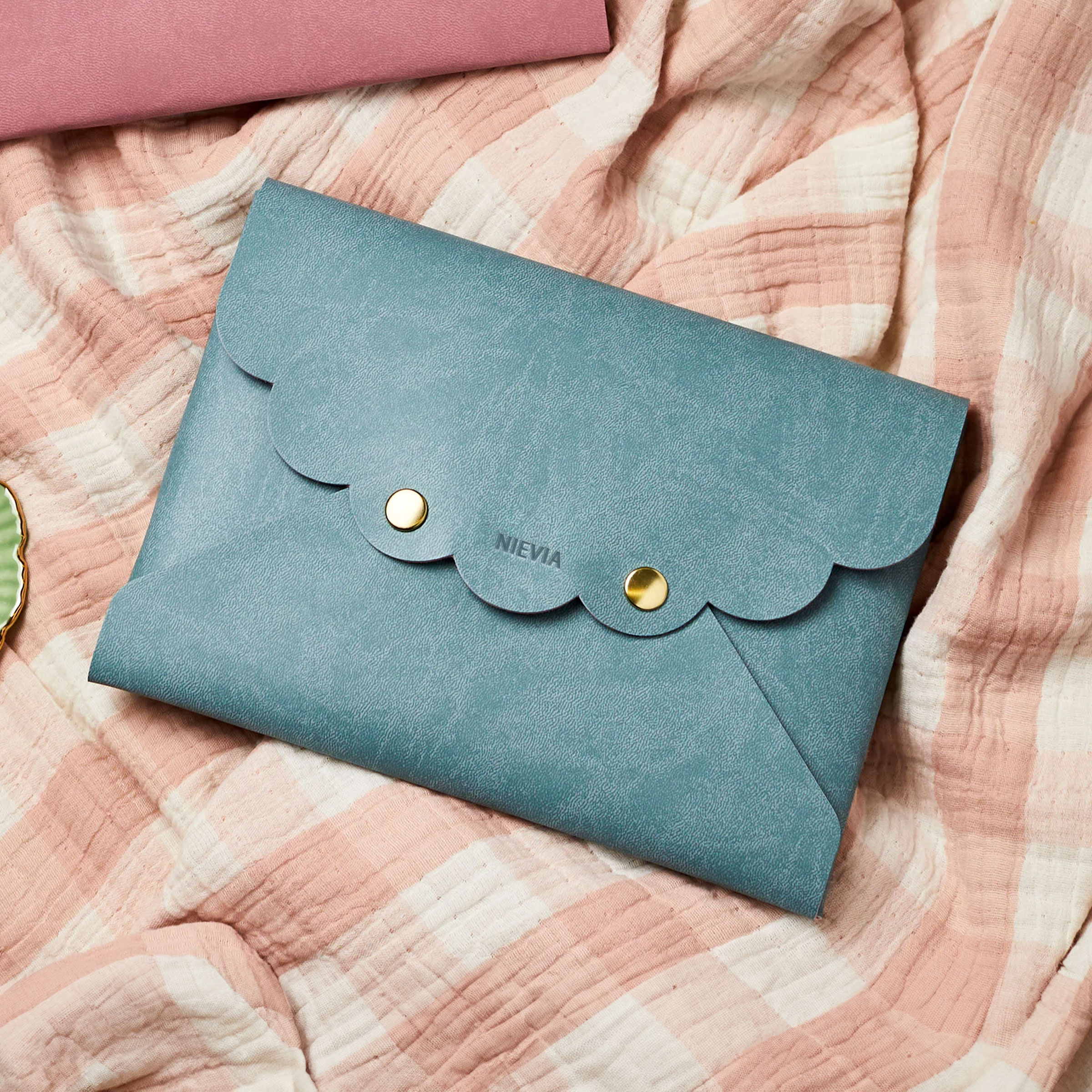 The vegan leather pouch is made from a soft faux leather with two gold metal popper/fasteners.