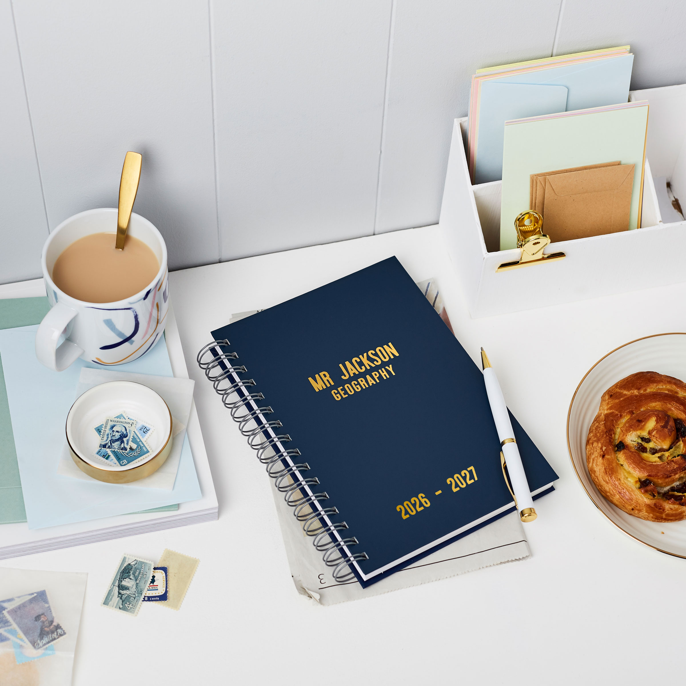 Lovingly made by hand in our studio. The luxury hardback covers are coated in a specialist book cover material that feels soft to the touch and printed with real foil. The personalised Teacher’s 2026-2027 Mid-Year Diary is filled with your choice of week-to-view or day-per-page diary pages for July 2026– July 2027, a 2026 and 2027 yearly planner, monthly calendar spreads, space for reflections and goal setting and several notes pages printed on thick (120gsm) blank white paper. The weekly diary contains 152 pages (or 76 sheets) and the daily diary contains 382 pages (or 191 sheets). There is also the option to add a luxury personalised inner page. The book has wire binding so it can be easily flipped open or laid flat to capture diary dates.