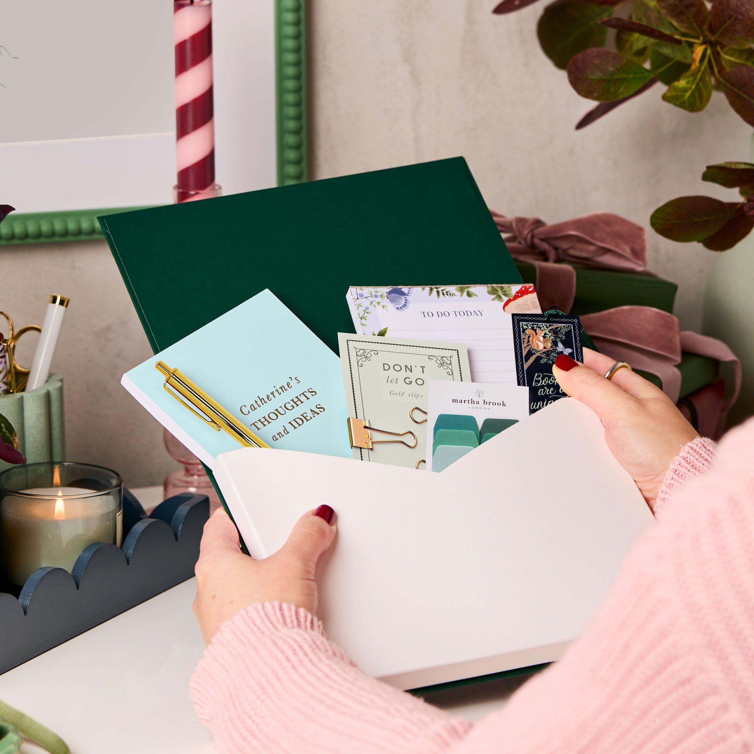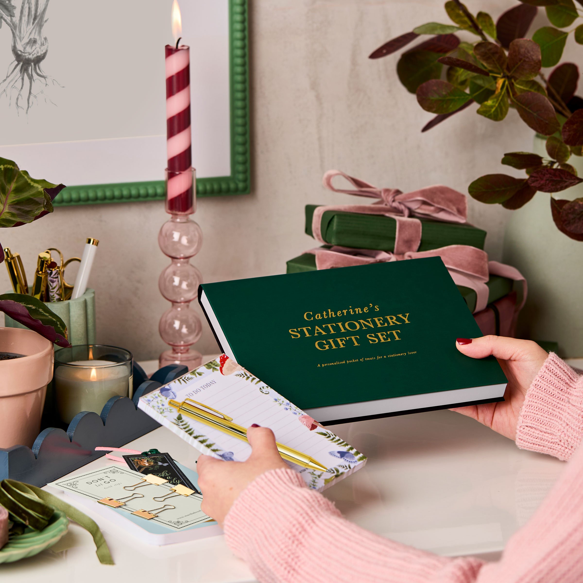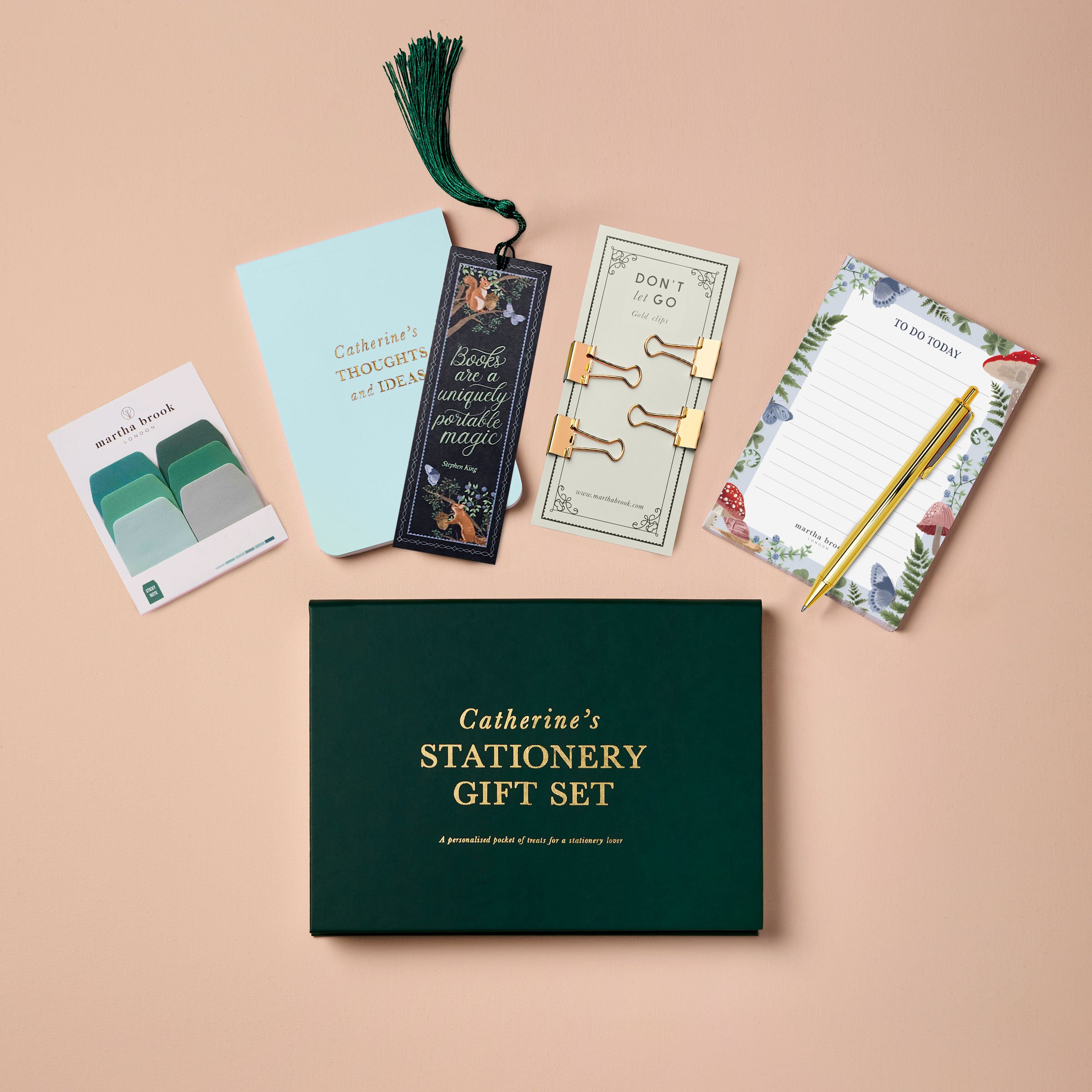 Inside the luxury foiled printed folder is an assorted set of beautiful stationery, inspired by enchanted woodlands. Included you can find a personalised notebook, a pen, a set of gold bulldog clips, a desk pad, a pack of sticky tabs and a woodland bookmark, all packed into a beautifully personalised pocket.